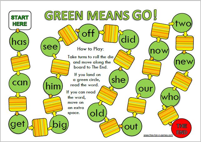 "Green Means Go" - printable game for Sight Words (MIOOW words 4 - Green words)